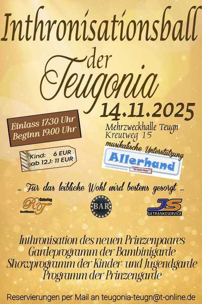 Unser Motto der Saison lautet „Teugonia'a ultimative Chartshow“. Dazu laden wir all unsere befreundeten Faschingsgesellschaften, sowie alle Faschingsfreunde aus nah und fern ein. Die Band „Allerhand“ lädt zum Tanzen ein und wir präsentieren Euch natürlich unser Garde- und Showprogramm der Saison 2025/26.